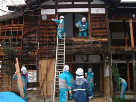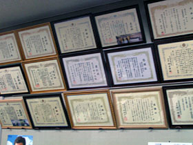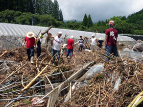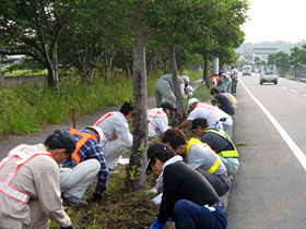 平成3年、延岡市の花火大会で河川敷の後かたづけ・清掃をさせていただこうというのが最初のきっかけ。参加の呼びかけをしたところ朝から大勢集まり、またたく間に片づいてしまったそうです。時間が余ってもったいないと思い、城山公園などに行ってみるとひどく汚れていて、やりがいを感じたといいます。それから月に1回、3〜4回と増え、「させていただく」の気持ちから始まった取り組みが、平成17年の台風災害復旧活動では「災害救助賞」を受賞するまでの活動規模に至ったということです。また花火大会には、平成3年以降、毎年各地区の花火大会の翌朝に出動しています。 |