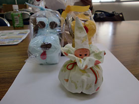 月に1〜2回、社協が空いている日に集まって、施設を訪問する際のお土産を作ります。タオル人形とか、貝殻を布に包んだものとか。それを持って老人介護施設などの福祉施設を慰問します。皆さん心待ちにされて、とても喜んでいただいています。定期的な訪問のほかに、運動会や創立記念日に招待してくださるところもあります。